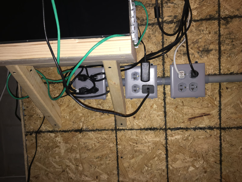 As you can see in the picture above, I made a fancy little shelf to hold my towers and laptop stand back here, so that this stuff could live out of the way, instead of under my desk at my feet, spewing hot air all over me:-) I just needed to get power to all this stuff, so I ran some conduit from the junction box where I left the ends of the circuits for this type of stuff, so that I would have easy access. Since I was doing it this way, I was also able to just pull the circuit and put plenty of outlets right at the equipment, rather than needing to rely on a dinky power-strip:
