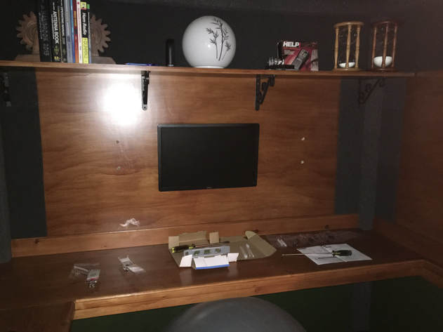 But wait...where did those wires go? Well, once I was sure the monitors where just where I wanted them, I swung them out of the way, drilled holes, and passed all the cabling through, back into the service area behind the operating position: